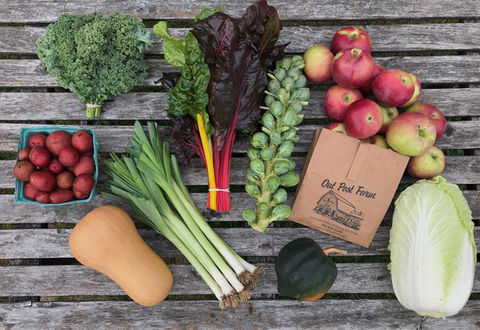 Our produce box is at least one half-bushel of Out Post Farm grown produce that we are harvesting that week. Your box will typically include 6-8 different vegetables each week. We recommend one box for families/groups with 2-4 people. In your box, you will find a full representation of the crops we are harvesting at that point in the season. The weekly produce box typically starts in mid-June and is available throughout the growing season.